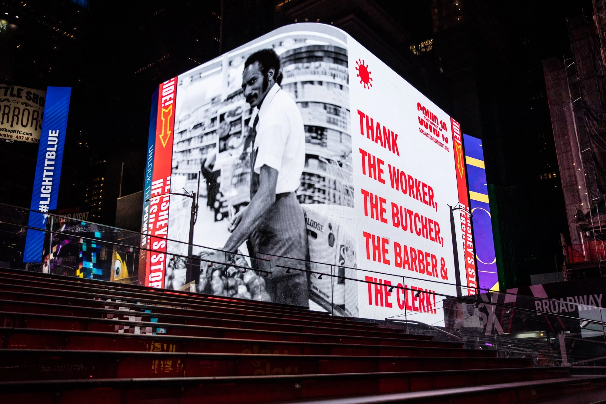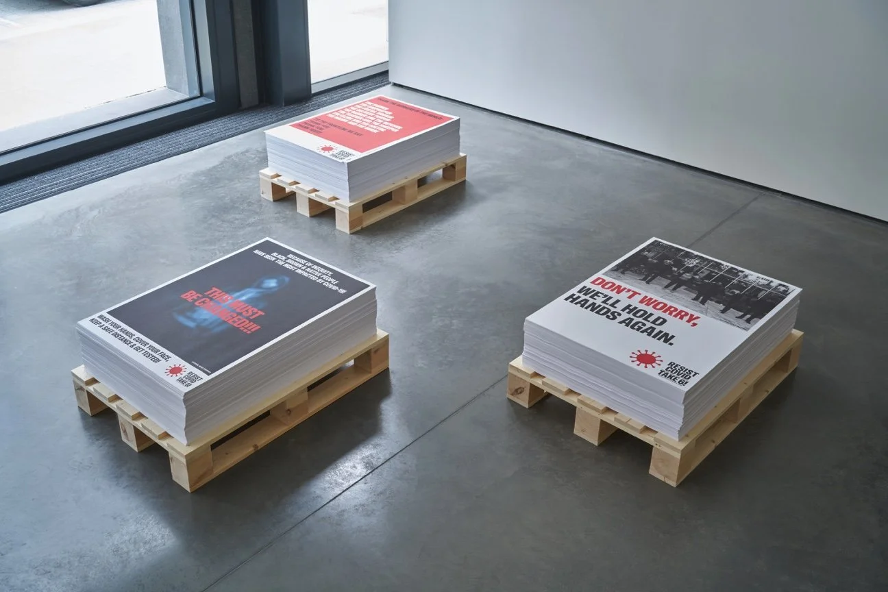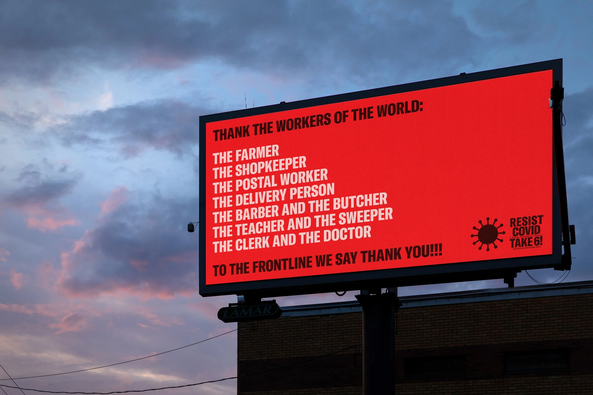 RESIST COVID TAKE 6! sees artist Carrie Mae Weems step away from her signature photographic tableaux and into the realm of agitprop art with a new public art campaign. In this series, Weems draws awareness to the ways in which racial inequities have manifested in the COVID-19 pandemic, with people of color inordinately at risk of the virus. The title, TAKE 6!, invokes the precaution for people to maintain a six-foot distance from one another and speaks to the urgency of Weems’ call to action. In a sequence of commanding billboards, Weems confronts viewers with the realities of this international health crisis while simultaneously providing notes of gratitude to workers within the health and service industries and making direct appeals for people to take preventive safety measures. With emphatic insistence, Weems implores passersby: “WASH YOUR HANDS, COVER YOUR FACE, KEEP A SAFE DISTANCE & GET TESTED!” The powerful text is projected against images that deliver a visceral gut punch. The words stretch across a frame of Black and Brown bodies — those most likely to succumb to this relentless disease.